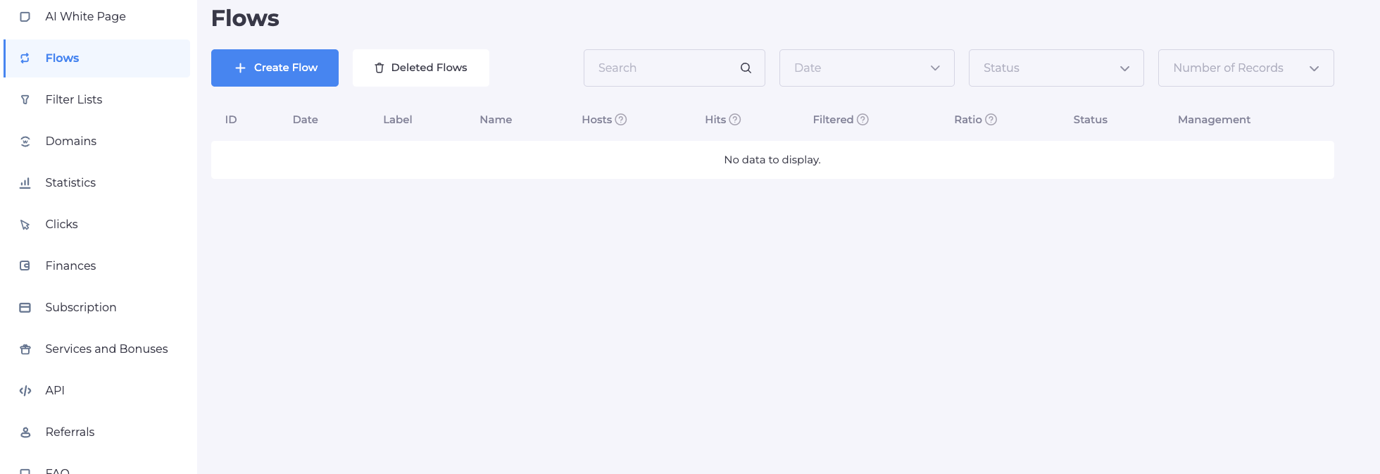 Once registered, navigate to the dashboard. You'll see the main sections: Flows, Statistics, Clicks, and Domains.